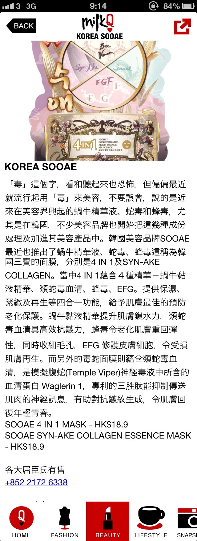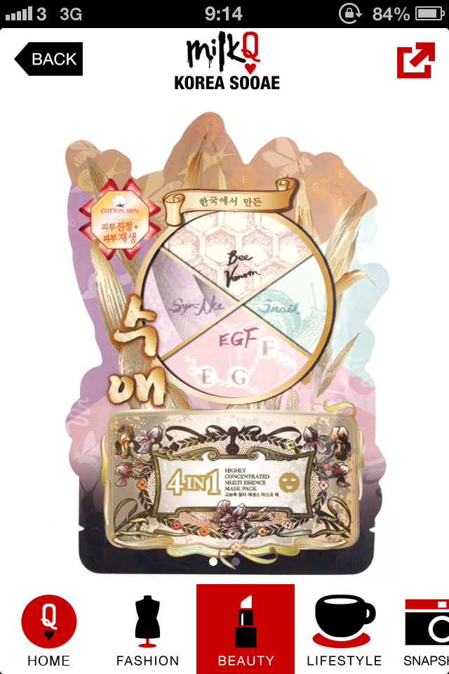 MilkQ #2013-11-26 2013-11-26 Related Products Korea Sooae 4 in 1 Multi Essence Mask Pack (1 PC) Korea Sooae Syn Ake Collagen Essence Mask Pack (1pc) View More Sooae Press